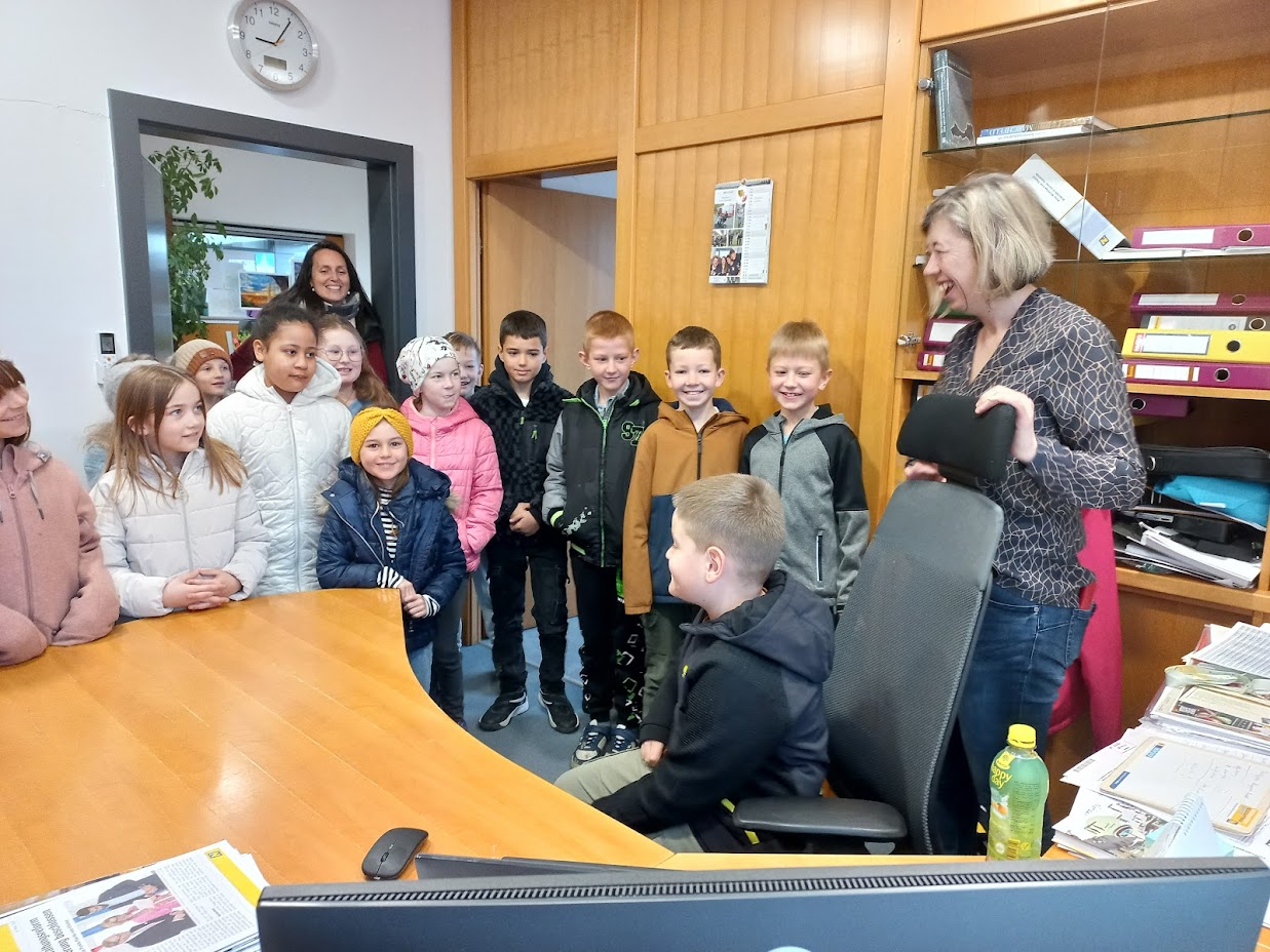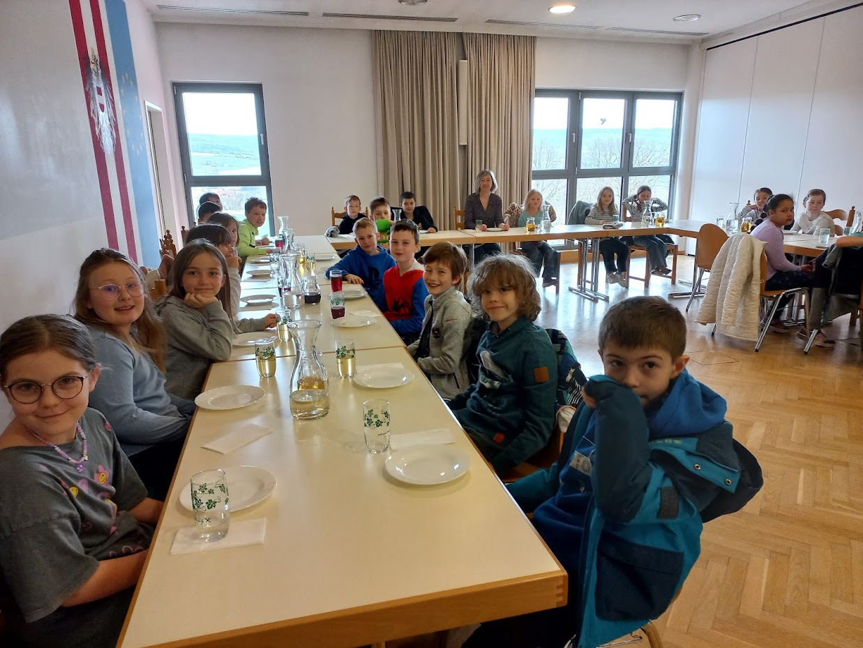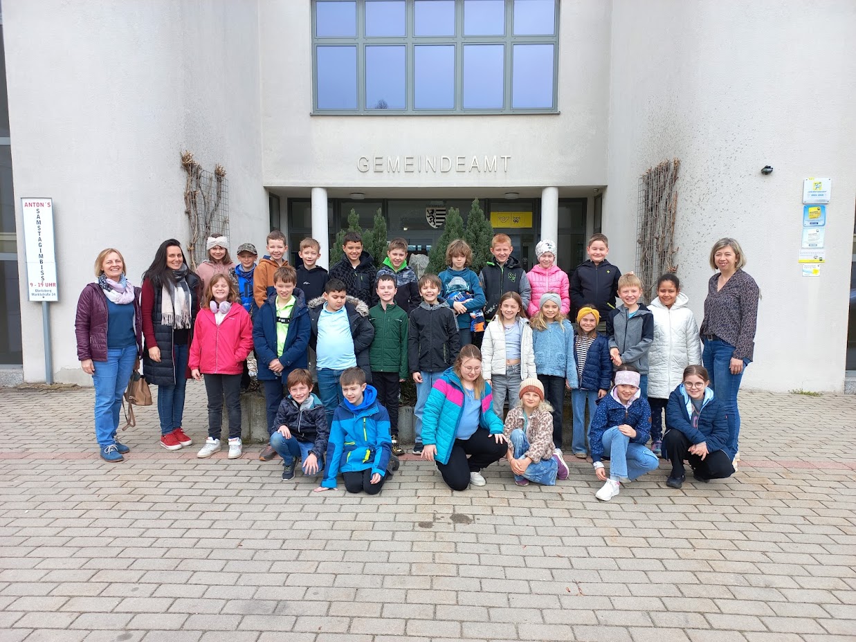 Am Dienstag, den 8. April, besuchten die beiden 3. Klassen auf Einladung der Bürgermeisterin Daniela Engelhart das Gemeindeamt in Obritzberg. Die Bürgermeisterin zeigte den Kindern die Räumlichkeiten der Gemeinde und lud sie zu einer Jause im Sitzungssaal ein. Dabei erzählten die Kinder, was sie alles über die Gemeinde gelernt hatten und konnten damit die Bürgermeisterin überraschen. Anschließend konnten sich die Kinder bei der Rundfahrt durch (fast) alle Gemeindedörfer ein BIld von der Größe der Gemeinde machen.