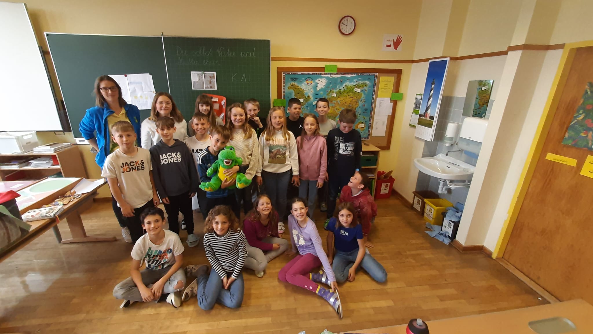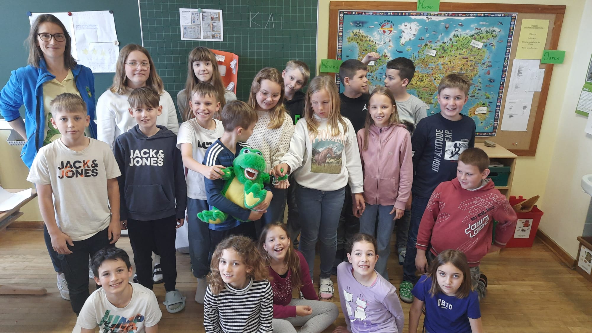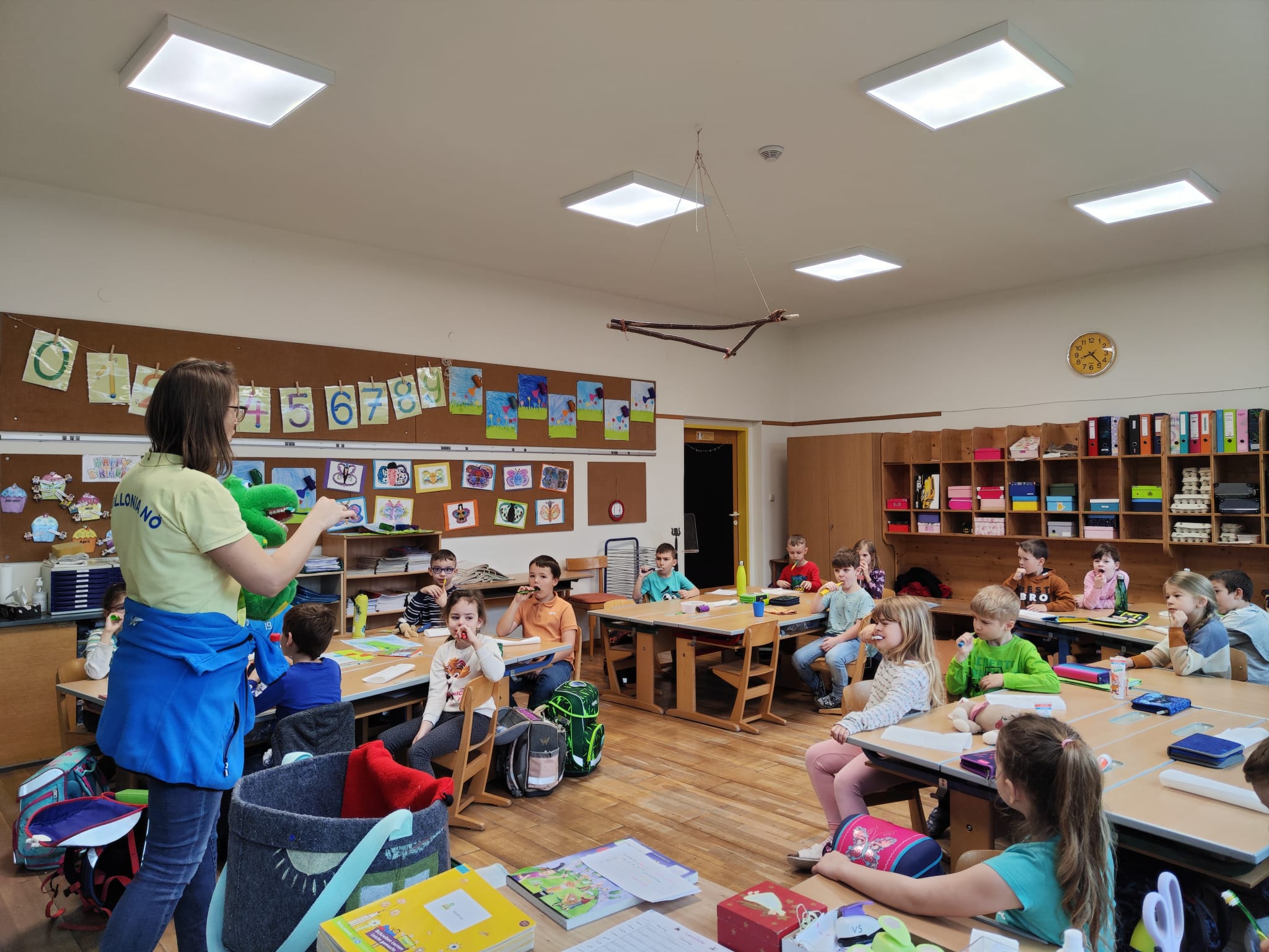 Im Zuge des Projektes Zahngesundheitserziehung "Apollonia" erhielten alle Schülerinnen und Schüler der 1. bis 4. Klasse Besuch von Kroko. Die Kinder haben sich über den Besuch des Zahnputz-Maskottchen sehr gefreut und viel Wissenswertes gelernt.