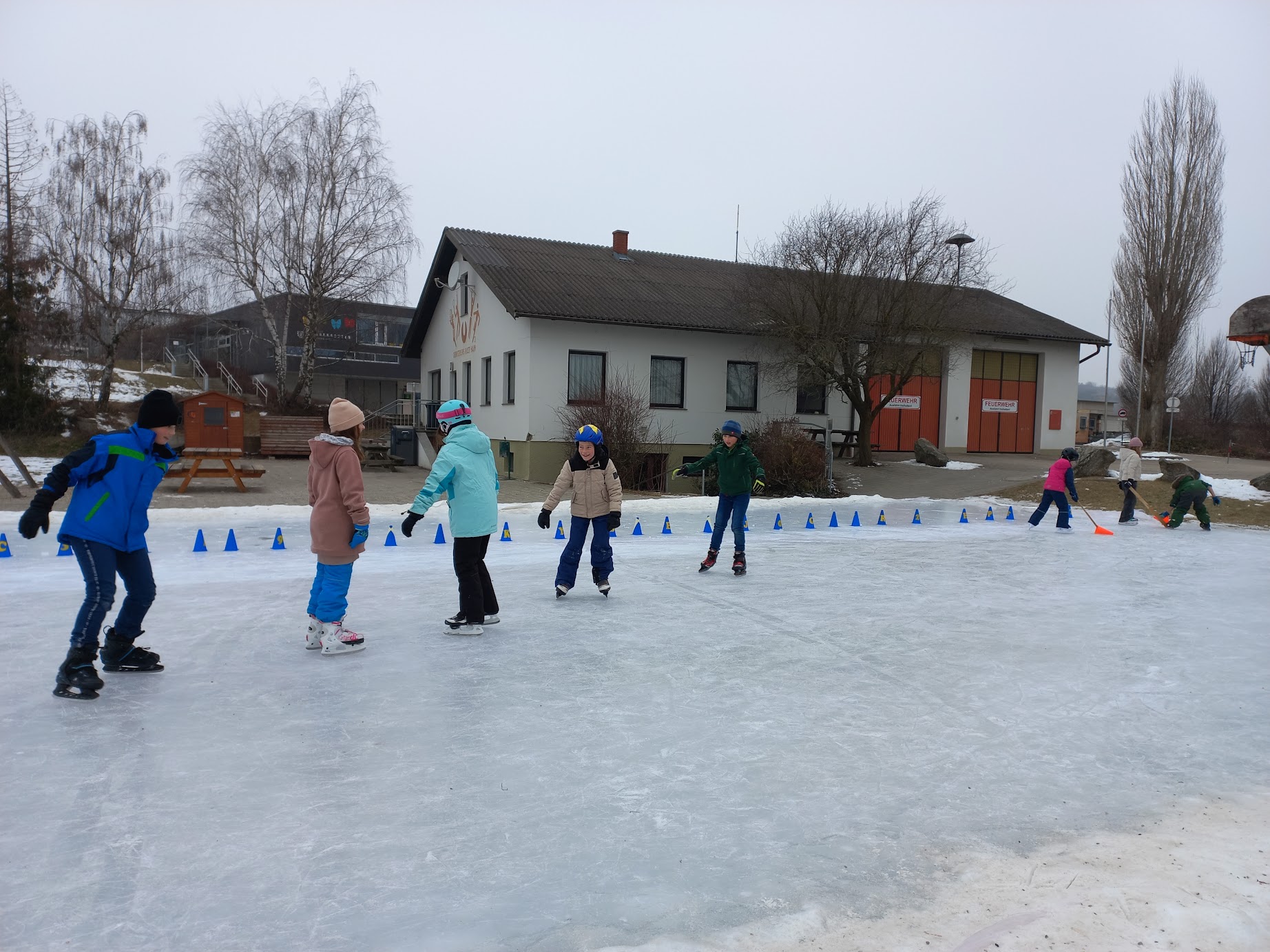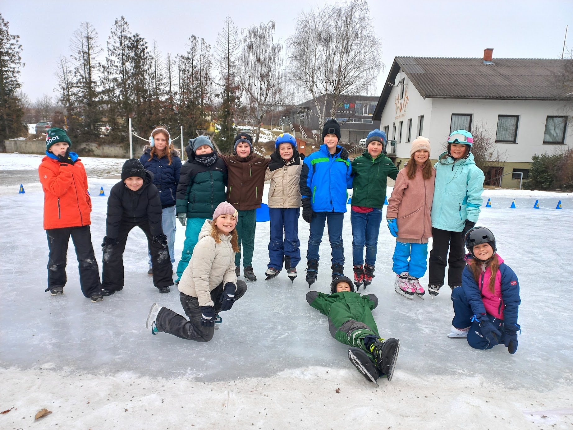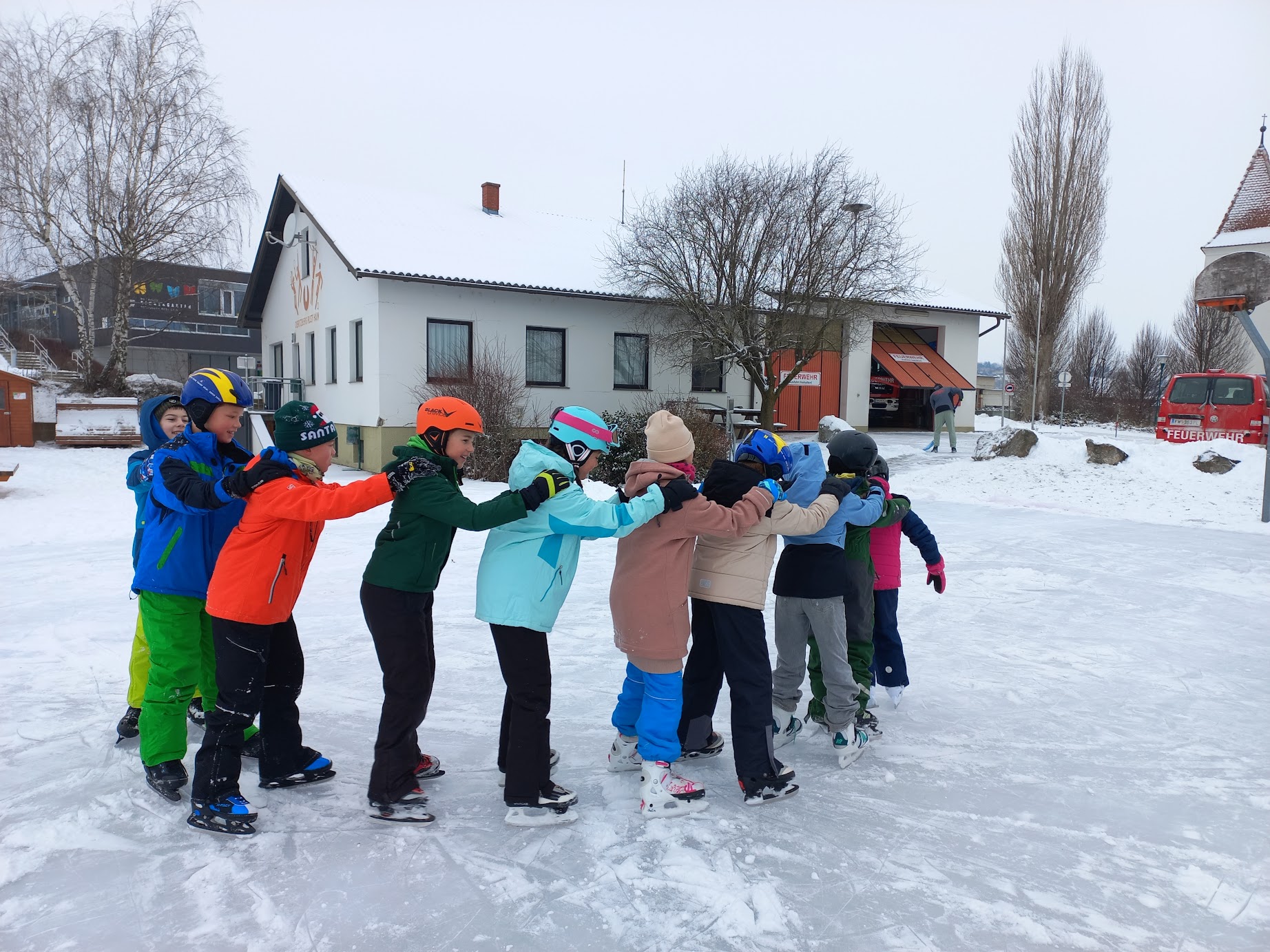 Dank der Initiative einiger Feuerwehrmänner und Dank der tiefen Temperaturen gibt es dieses Jahr wieder einmal einen Eislaufplatz in Großrust. Ob in der Pause beim Schleifen oder in der Turnstunde beim Eislaufen, die Freude dabei ist immer groß, wie man hier bei der Klasse 4b gut sehen kann.