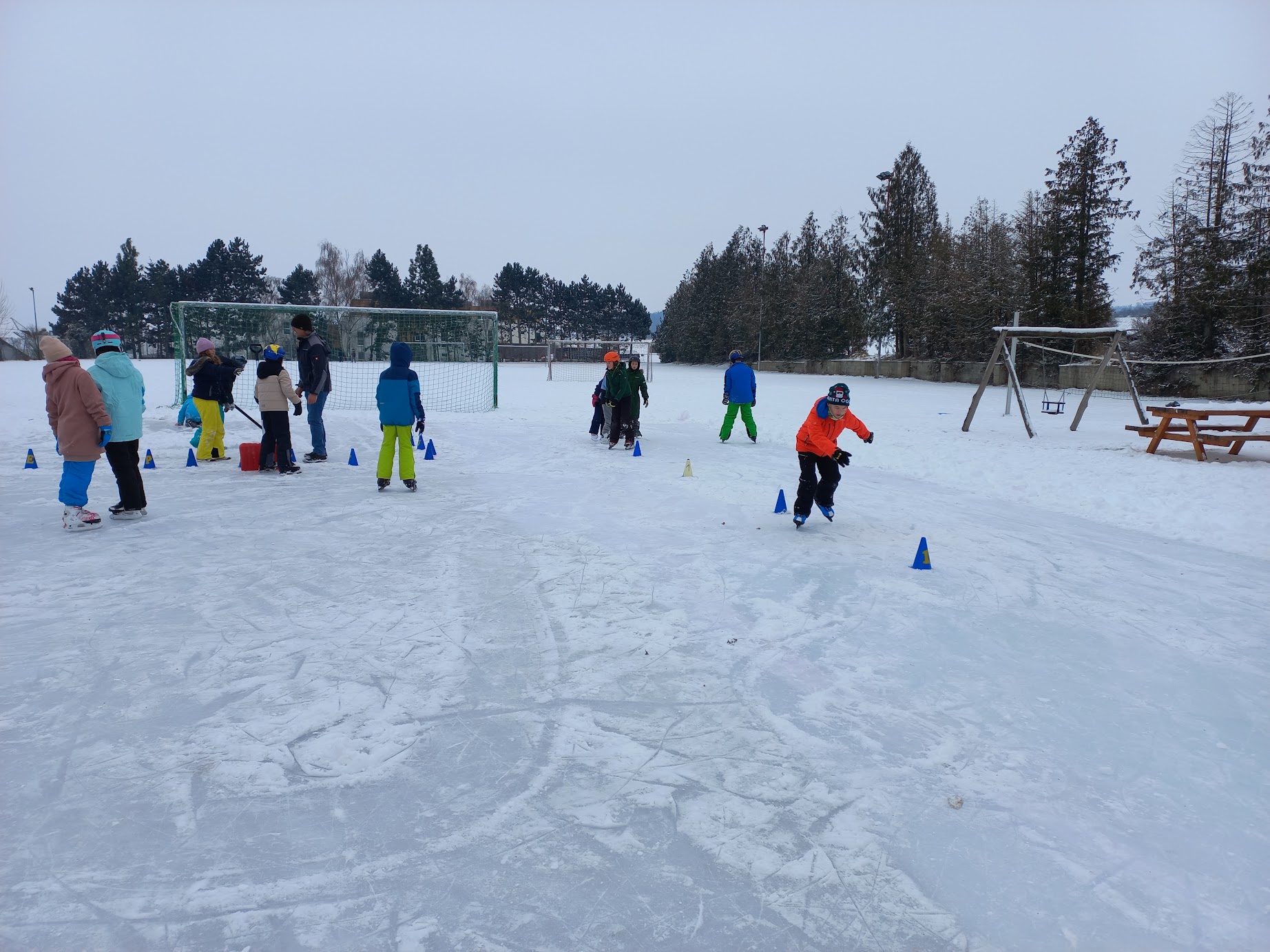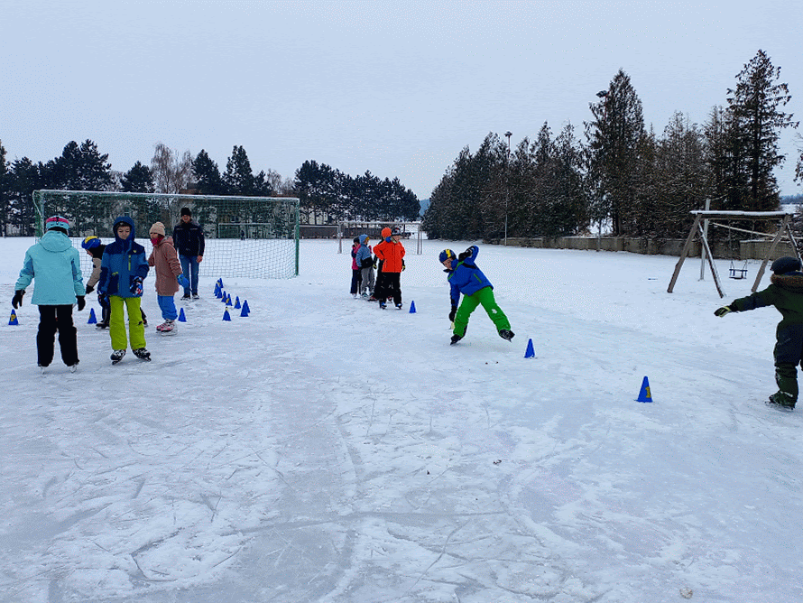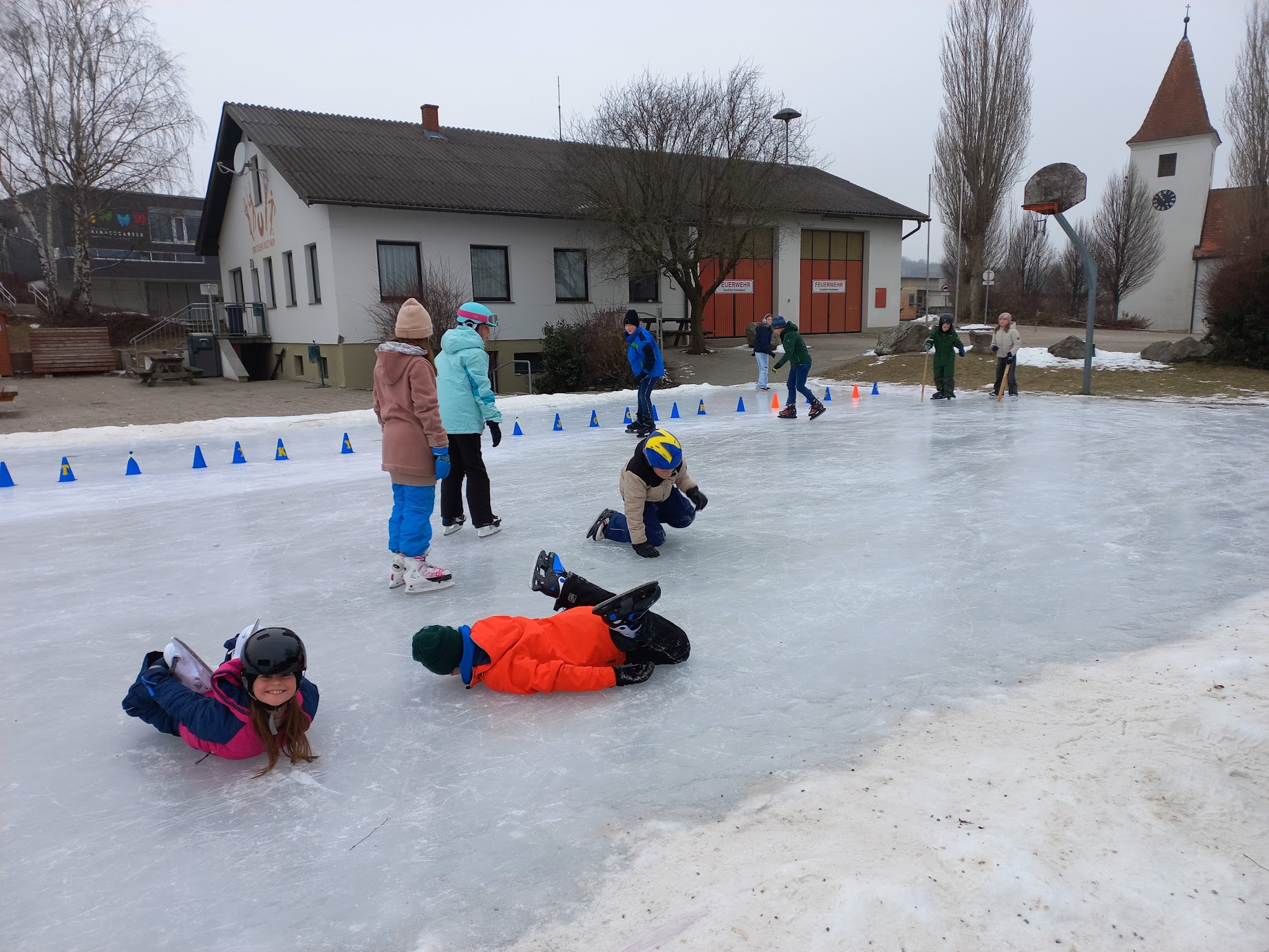 Dank der Initiative einiger Feuerwehrmänner und Dank der tiefen Temperaturen gibt es dieses Jahr wieder einmal einen Eislaufplatz in Großrust. Ob in der Pause beim Schleifen oder in der Turnstunde beim Eislaufen, die Freude dabei ist immer groß, wie man hier bei der Klasse 4b gut sehen kann.