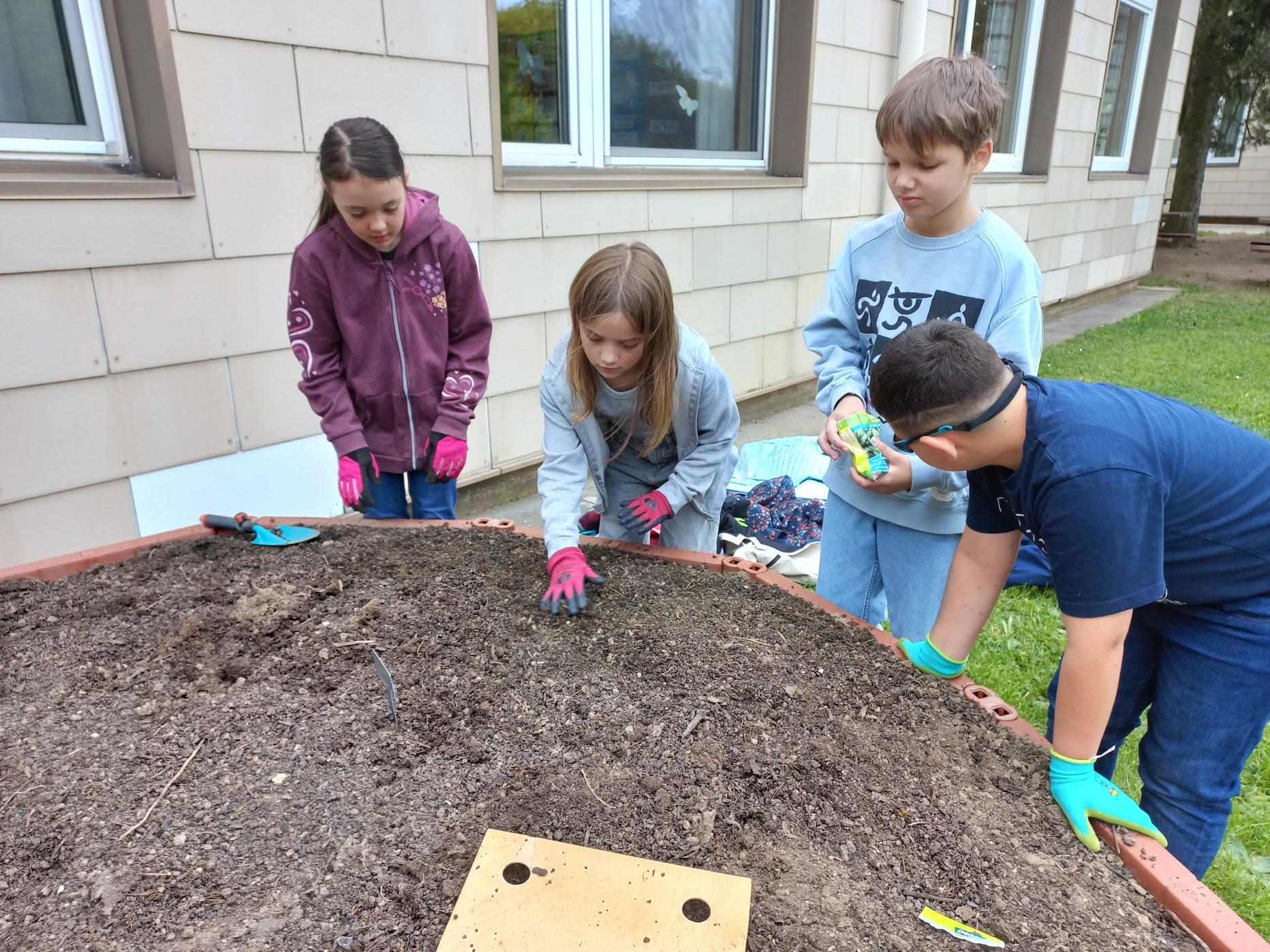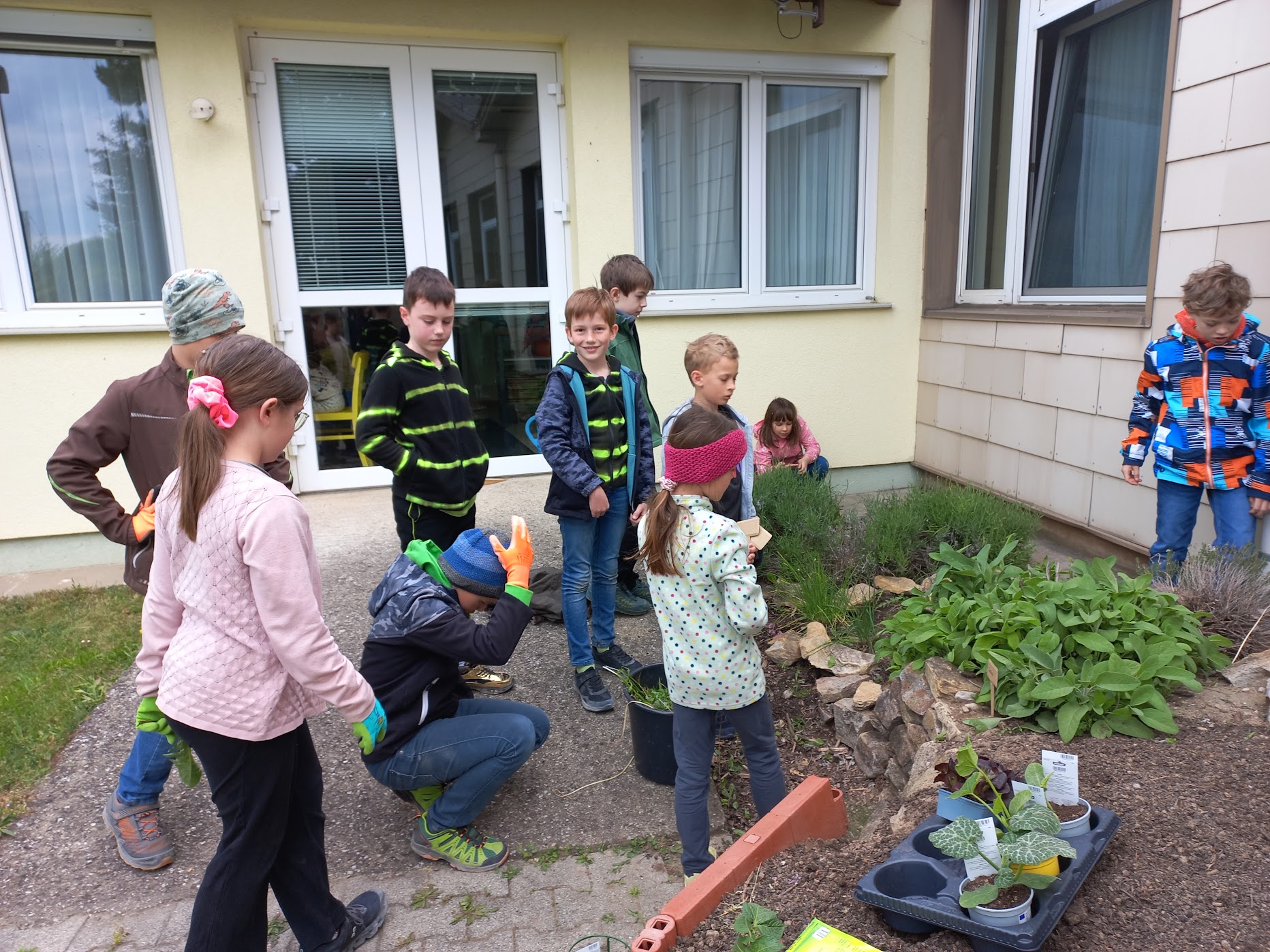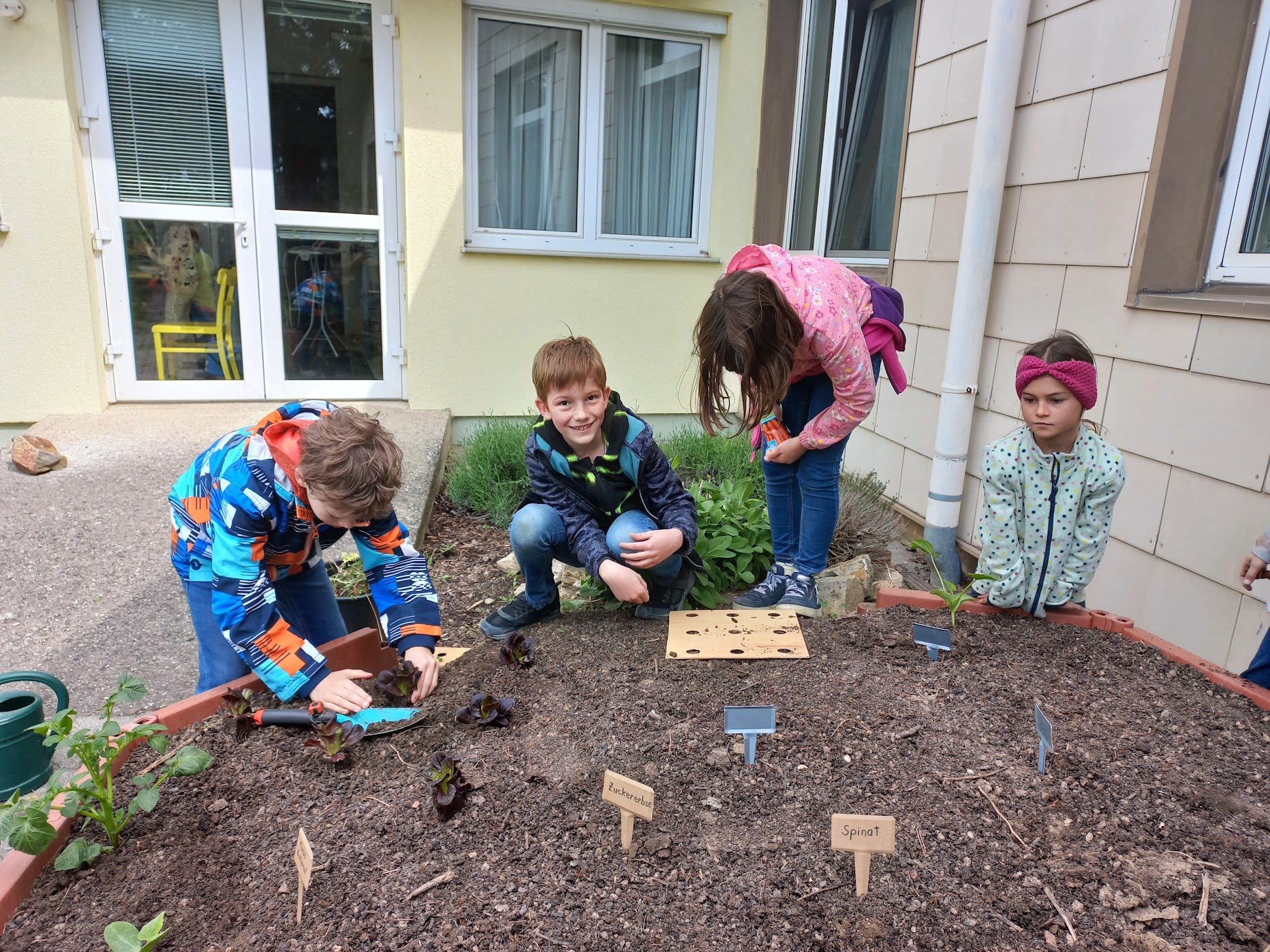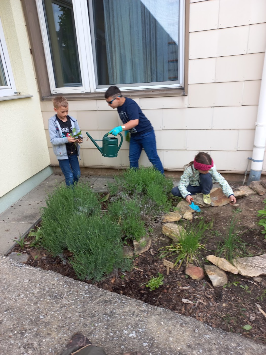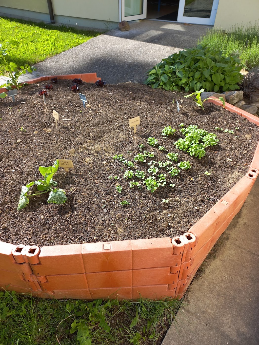 In diesem Jahr bepflanzt und bearbeitet die 3b - Klasse das Hochbeet. Die Kinder sind mit Feuereifer dabei und schon nach kurzer Zeit sprießen die ersten Samen.